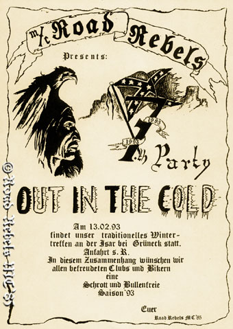 1993 war die letzte Winterparty, die wir an der Isar durchzogen. Behördliche Willkür, das Rumnerven der Cops und “Naturschützern” zwang uns dazu, eine andere Location zu suchen. Gäste dieser Veranstaltung: Bavarian Cowboys MC, Biker Friends MC, Chaindogs MC, Custodes MC, Champions MC, Dusty Brothers MC, Damned Drivers MC, Engalsbuam MC, Eternal Friends MC, Four Roses MC, Freaks MC, Fire Dragons MC, Hell Drivers MC, Hawks MC, Iron Horse MC, Iskariot MC, Legion MC, MC Osterwald, Night Petrol MC, Road Bomber MC, Uncommon Ghost MC, Wolpertinger MC, MF Freimann, Mf Weißendorn, MF Oberbayern, uvm.